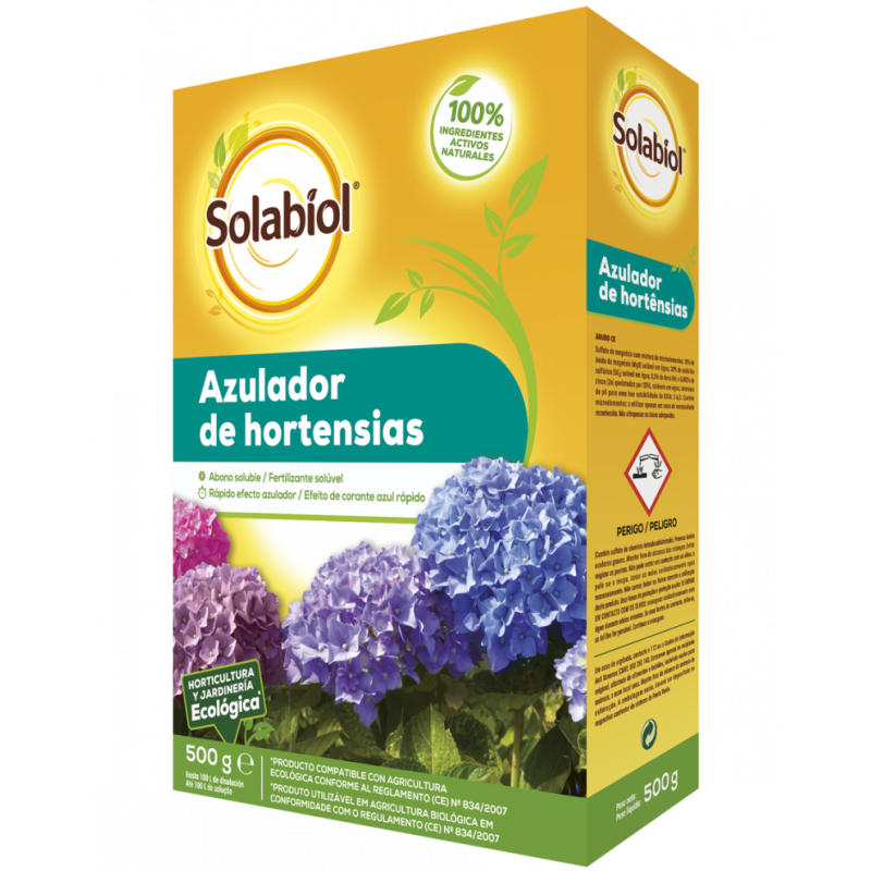 Abono orgánico azulado de hortensias de especial formulación, de aplicación por riego o incorporado directamente al suelo, adecuado para conseguir cambiar el color claro (blanco o rosa) de las flores de las hortensias a un azul espectacular de forma rápida, con ingredientes 100% naturales.