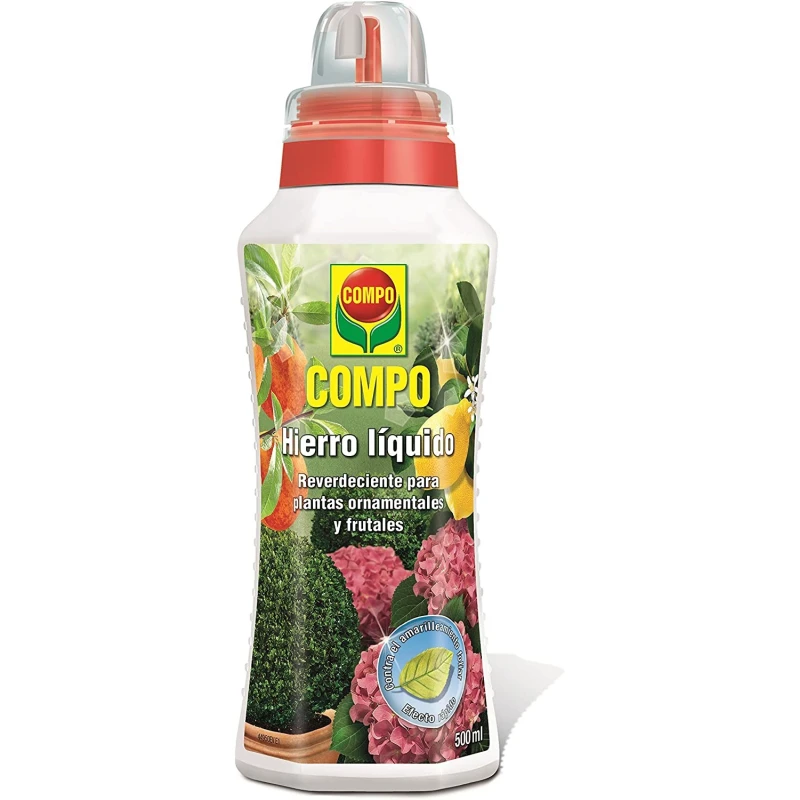 Compo Hierro Líquido es un abono específico para la prevención y el tratamiento del amarilleamiento foliar debido a la carencia de hierro de las plantas (clorosis férrica).