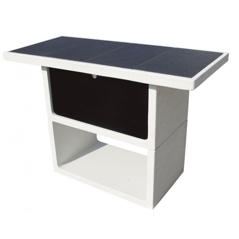 Barbacoa completa fabricada en hormigón con acabado liso. Azulejo "vulcan", color piedra blanco. Mesa lateral permite elegir el lado del saliente izquierda o derecha. Con hogar metálico, chimenea incorporada, su...