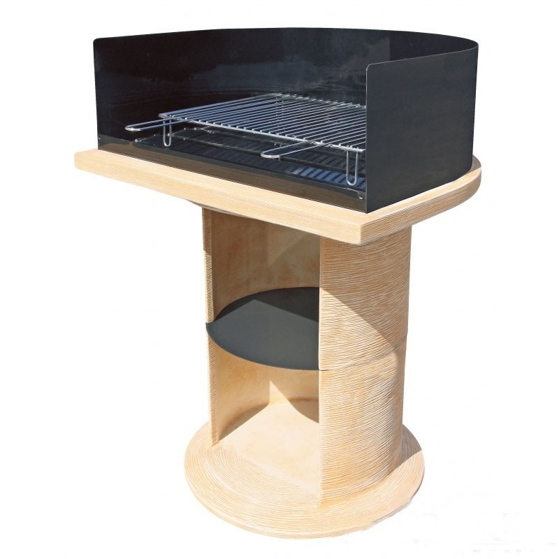 Barbacoa pequeña redonda fabricada en hormigón, preparada para el exterior. Hogar y estantería metálicos. Incluye parrilla acero cromado. Uso exclusivo carbón vegetal.