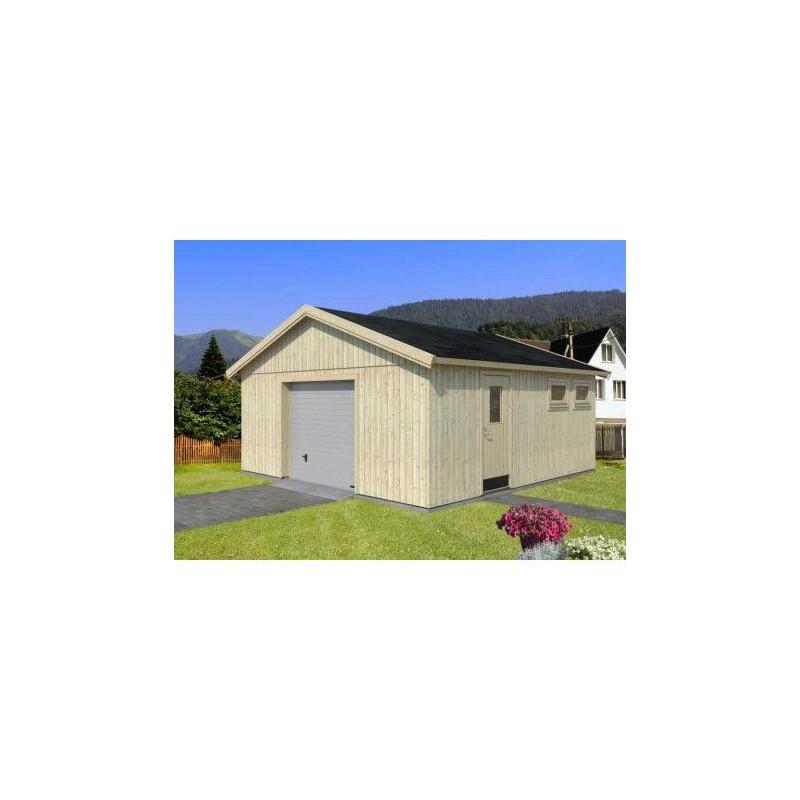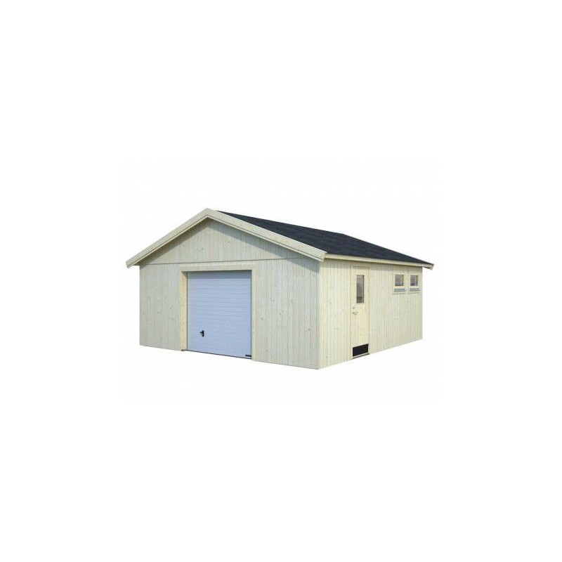Garaje de madera muy resistente a la intemperie, especialmente a la lluvia y el viento. Fabricado con madera natural de abeto nórdico. Ventanas con doble cristal térmico de apertura hacia el exterior. Aconsejamos pintura de barniz al agua ó pintura lasur que penetra profundamente en la madera dejando respirar a la madera y no formando una película. Garantía 5 años.