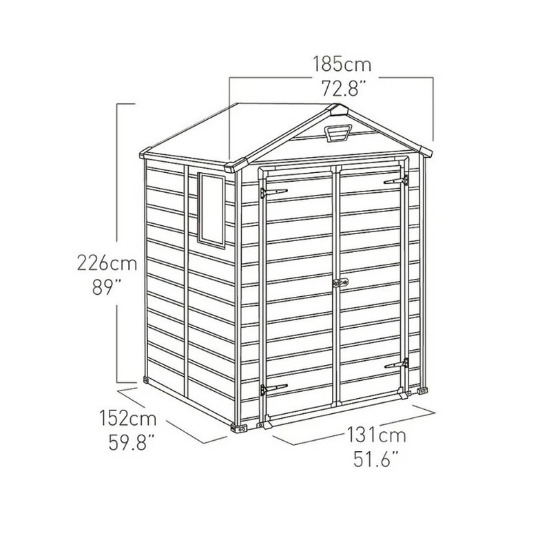 * Una ventana fija integrada para asegurar una buena iluminación natural en el interior del cobertizo. La ventana está pre-montado en un panel lateral que se puede colocar en 4 ubicaciones posibles de acuerdo a su deseo y sea capaz de aprovechar la luz natural.