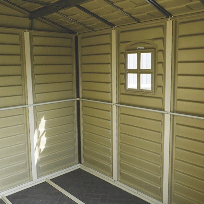 Las casetas de PVC WoodSide de Duramax son de paneles de PVC extrusionados lo que nos garantiza la homogeneidad del panel en toda su extensión, el PVC tiene como atributo mayor durabilidad y una reacción autoextinguible ante la acción del fuego, gracias al encapsulamiento se le aporta una protección frente a los rayos ultravioletas.