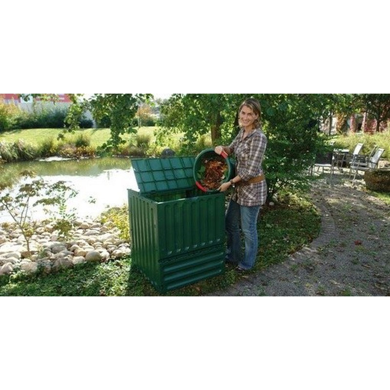 Compostadora con una gran capacidad que nos permitirá compostar los residuos del jardín junto con los de la cocina. Llenado fácil a través de dos amplias aberturas superiores para verter el residuo y dos inferiores para extraer el compost. Ajuste de la tapa contra el viento. Rápido proceso de compostaje.