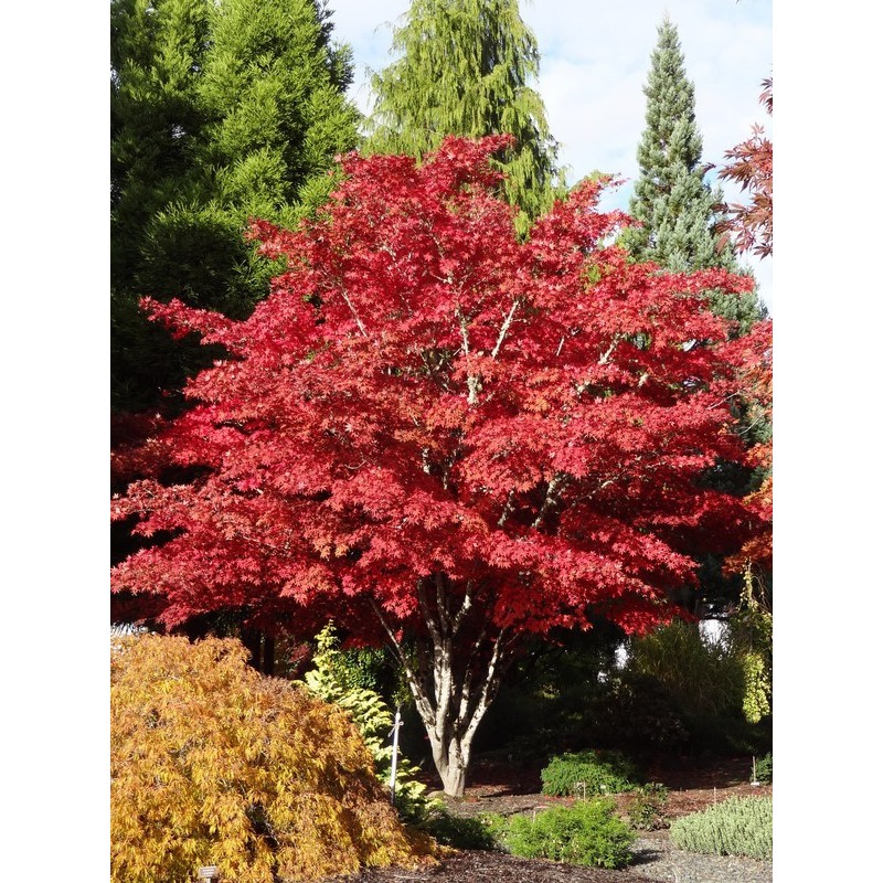 Un arce japonés también llama la atención para el jardín produce hojas de color rojo brillante en otoño. Estas hojas se dividen en varios lóbulos. Durante la primavera, las hojas se vuelven moradas. Este color se profundiza en verano. Con este árbol en tu jardín tienes una vista diferente cada temporada.