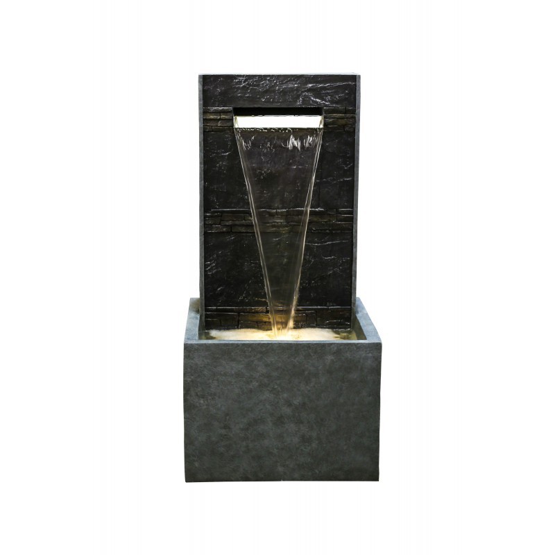 Elegante fuente Oslo de diseño, con líneas rectas, moderna arquitectura y su iluminación mediante LED. Donde las aguas cristalinas descienden en forma de cascada. Funcionamiento del agua en circuito cerrado.