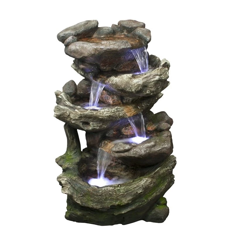 Espectacular fuente con 4 saltos de altura entre sus diferentes niveles, dotada de un motor que mantiene el agua en constante movimiento y un sistema de iluminación LED, se adaptan a los espacios dotándoles de luminosidad y de sonidos relajantes que proporciona el agua al salir. Fabricada en poliresina es una mezcla de varias resinas que al calentarse se transforman en una resina muy flexible y moldeable, un material muy duradero, ligero y resistente.  Válida para exterior e interior. Sin montaje.
