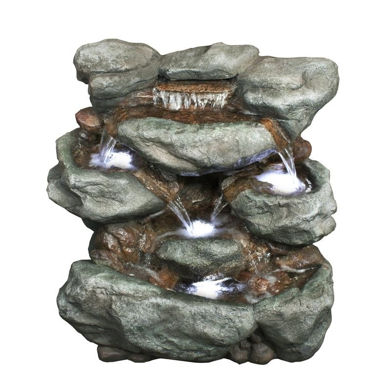 Fuente de agua decorativa diseño atemporal imitando una cascada. Fabricada en poliresina material muy duradero, ligero y resistente, para interior y exterior con las que crear ambientes relajantes. Tiene un ciclo continuo de agua que discurre a través de 4 saltos iluminados con 4 LED. No necesita montaje.