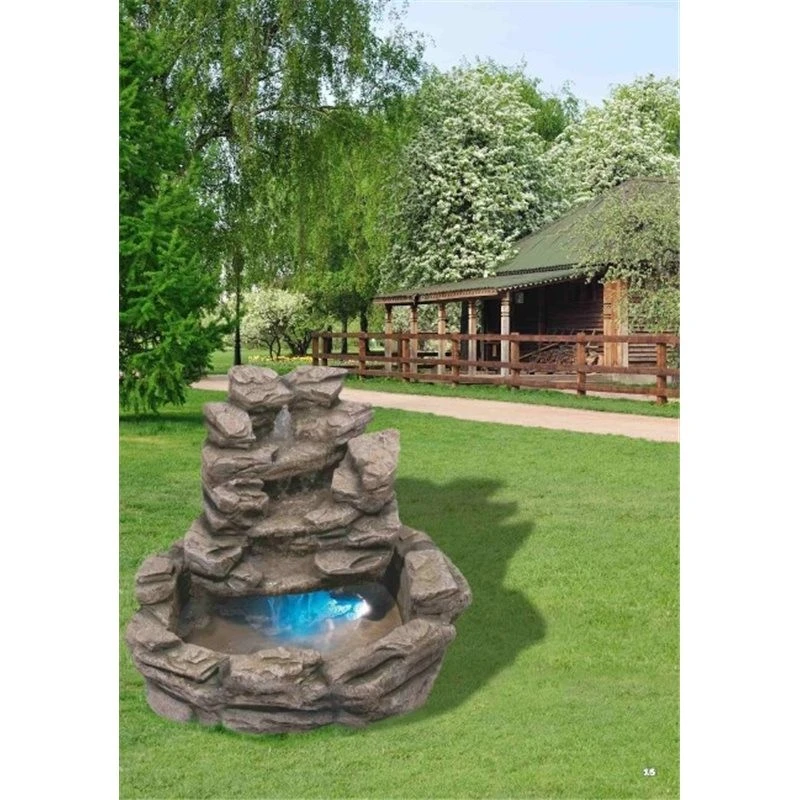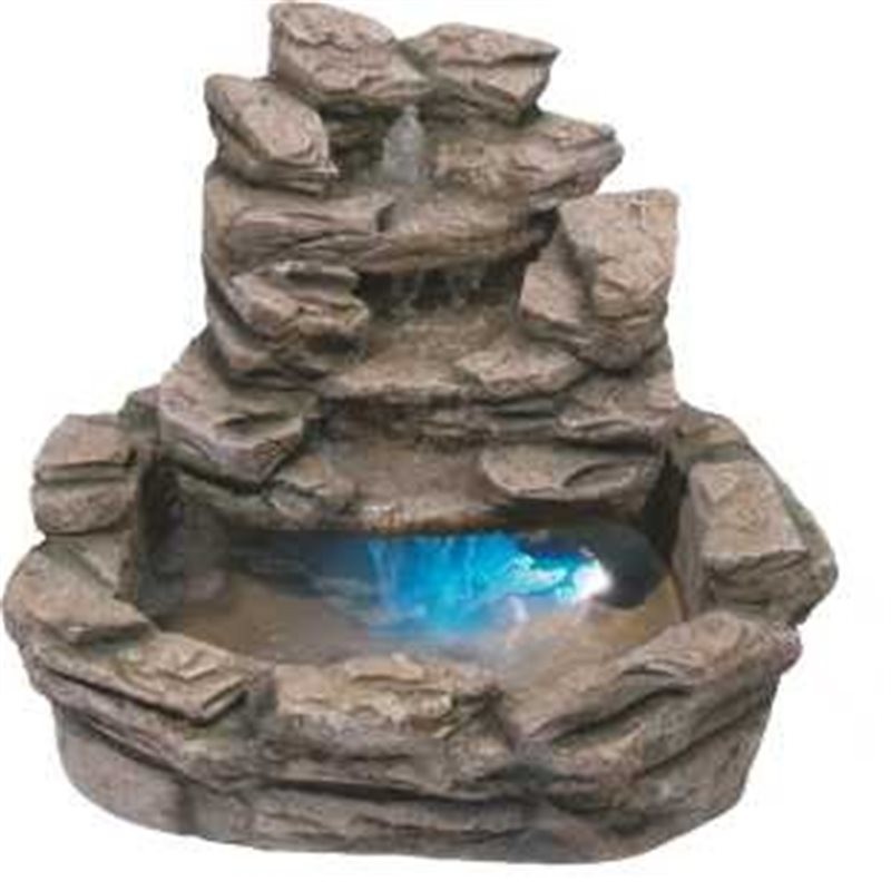 Fuente de jardín modelo beige con un perfecto acabado hace que la sensación óptica sea de autentica roca natural. Está fabricada de poliresina, es una mezcla de varias resinas, material muy duradero, ligero y resistente. La fuente consta de un lago inferior que dispone de luz halógena color, se alimenta de agua que discurre por una cascada a través de 4 saltos. Válida para exterior e interior. Requiere montaje aunque es realmente sencillo.