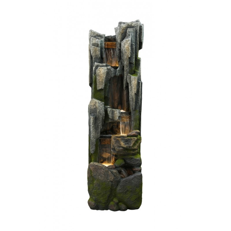 Fuente de jardín alargada por donde descienden cascadas de diferentes alturas, dotándola de luminosidad y de los sonidos relajantes y armoniosos que proporciona el agua al fluir. Fabricada en poliresina es una mezcla de varias resinas, que al calentarse se transforman en una resina muy flexible y moldeable, que cuando seca y enfría, se endurece formando así un material muy duradero, ligero y resistente. Válida para exterior e interior. No necesita montaje.