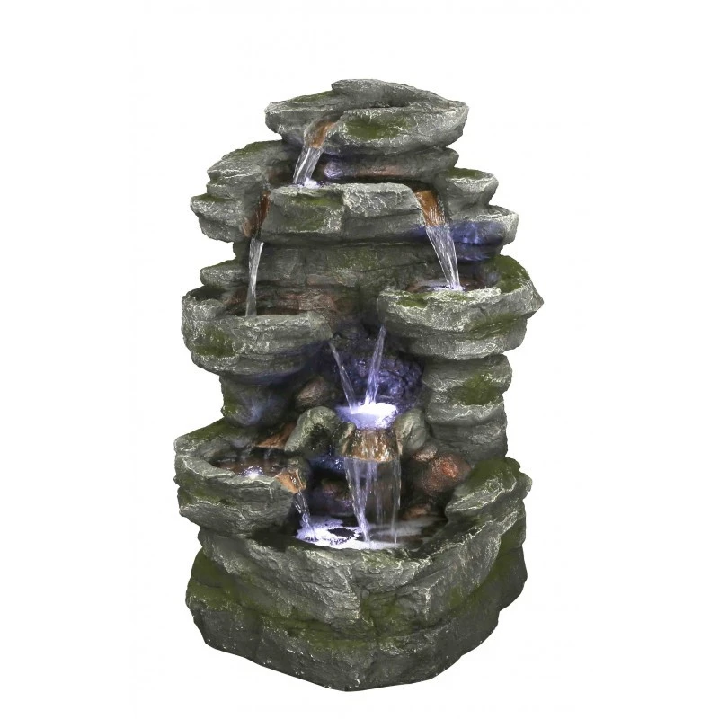 Fuente de jardín imitando una cascada dotándola de luminosidad y de los sonidos relajantes y armoniosos que proporciona el agua al fluir. Fabricada en poliresina es una mezcla de varias resinas, material muy duradero,...