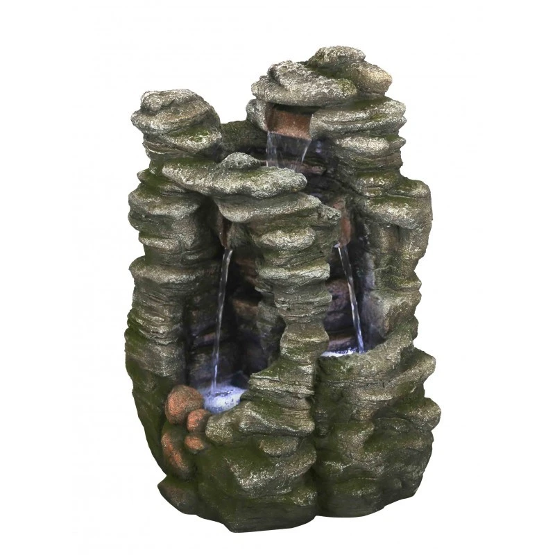 Fuente Misisipi ligera y resistente, por donde fluye una cascada de diversos orificios para converger y luego separarse en dos. Fabricada en poliresina es una mezcla de varias resinas, que al calentarse se transforman en una resina muy flexible y moldeable, que cuando seca y enfría, se endurece formando así un material muy duradero, ligero y resistente. Valida para exterior e interior. Sin montaje.