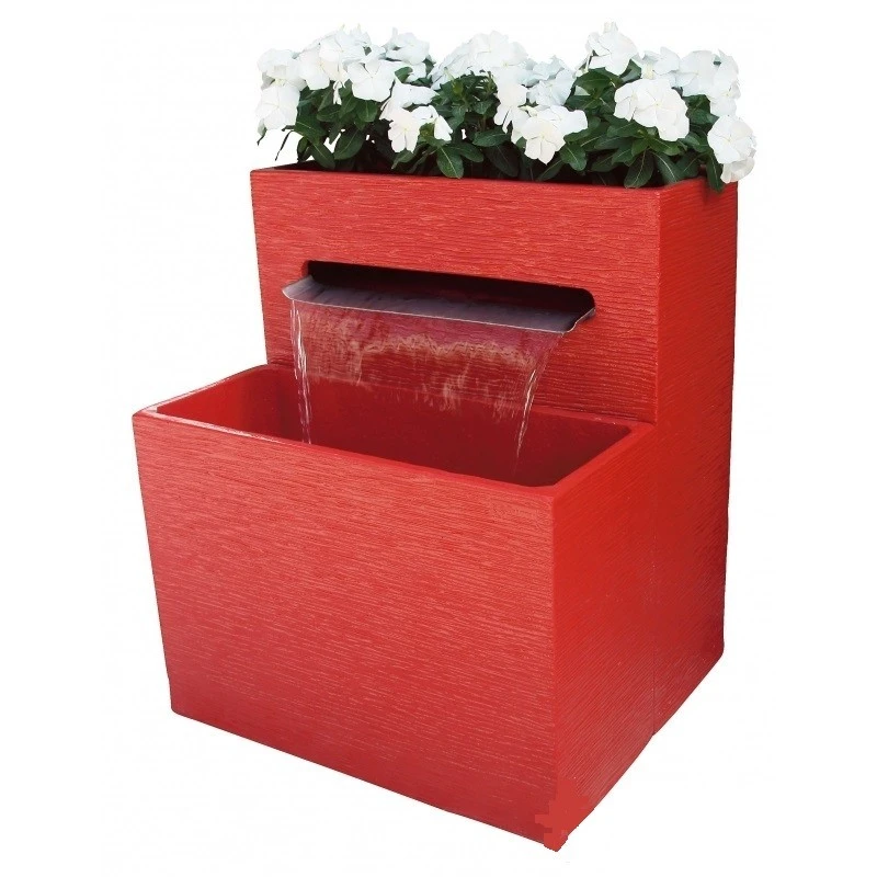 Fuente Arinsal su salida de agua recuerda a una cascada. Lleva un mini macetero que te permite añadirle vida vegetal. Gracias a su apariencia, puede incorporarse perfectamente con sus jardineras. Viene con una bomba de agua que lleva un caudal de 2500 litros hora.
