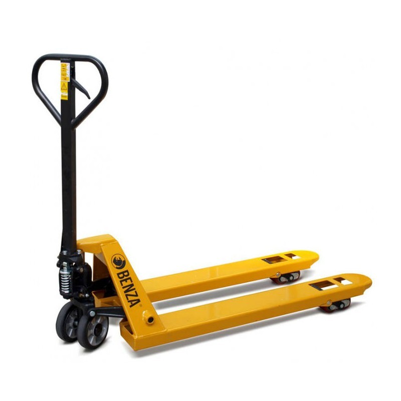 Transpaleta manual de Benza, BZ 20915, perfecta para elevar y transportar cargas de hasta 2000kg. Con timón ergonómico, bomba hidráulica y 2 ruedas directrices de 18 cm de Ø para garantizar un manejo sencillo y cómodo. Está diseñada para facilitar los trabajos de logística y almacén. Recomendada para lugares pequeños con poca maniobrabilidad.
