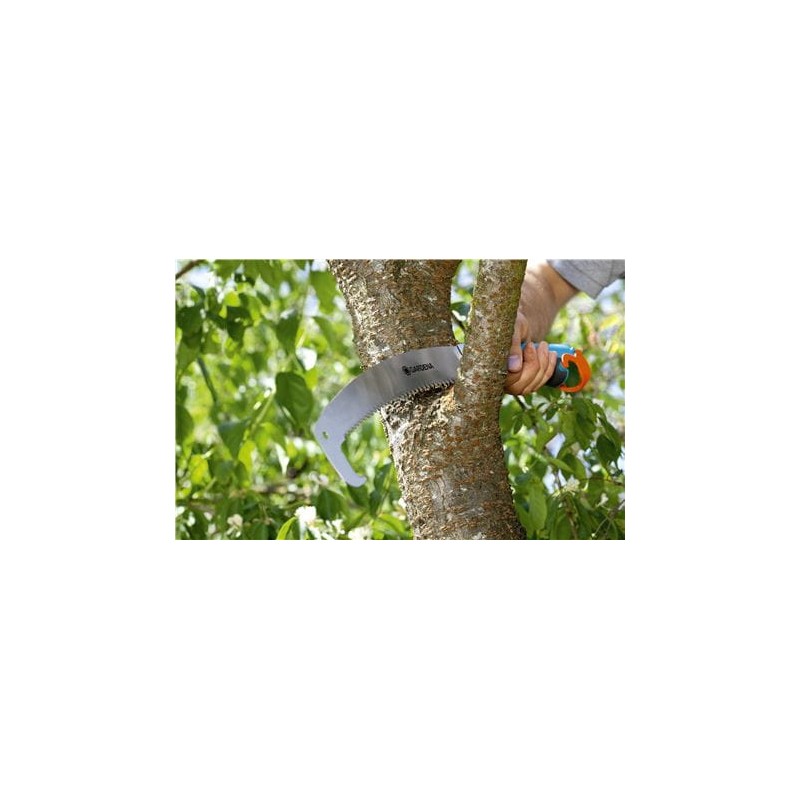 Debido a un recubrimiento especial, la sierra está muy bien protegida contra el óxido. La protección en el extremo del mango evita el deslizamiento incluso durante movimientos de tracción. Es fácil de quitar ramas utilizando el gancho para retirar ramas. Esta sierra se puede colgar por el ojal integrado, y la hoja de sierra se puede proteger con la funda protectora.