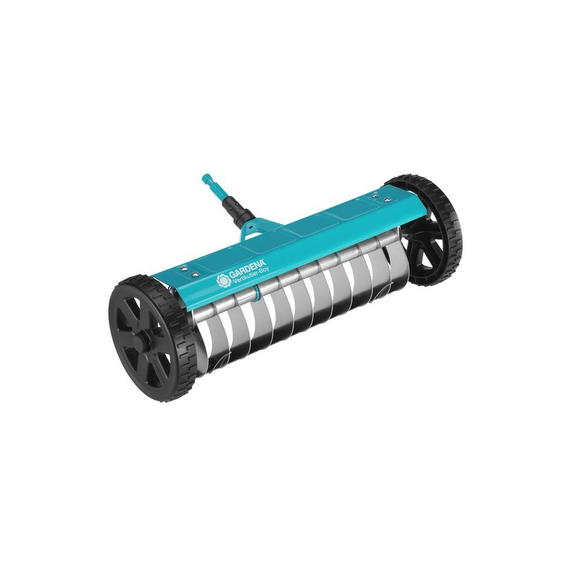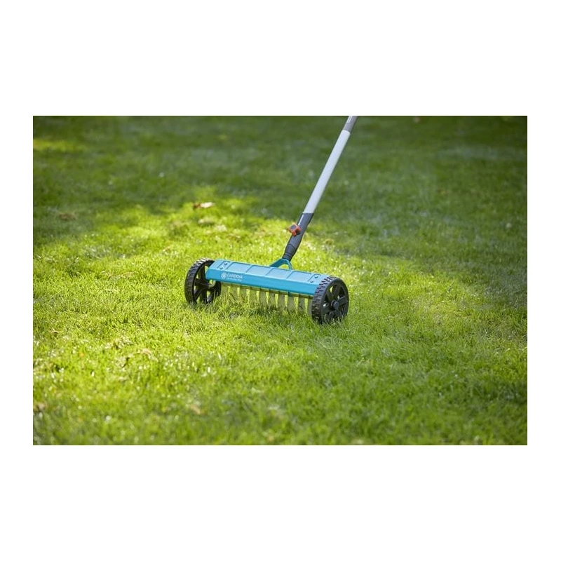 Con el escarificador con ruedas combisystem Gardena puede eliminar el musgo, la paja y las malas hierbas del césped. Mejora la absorción de aire, agua y nutrientes del césped. Las cuchillas especiales con partes posteriores deslizantes de acero inoxidable de alto grado penetran varios milímetros y eliminan las hierbas y el césped muerto de la tierra. Las robustas ruedas, con dibujo especial y un eje de apoyo, facilitan el trabajo.