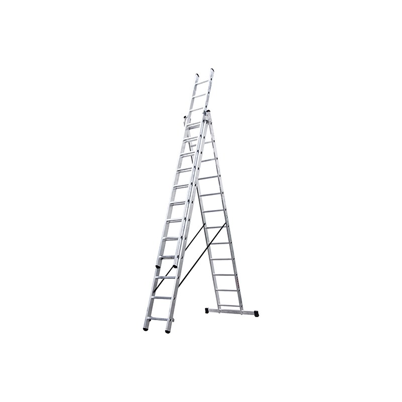 Escalera aluminio extensible de 3 tramos de 14 peldaños. Con barra estabilizadora y una altura apoyada de 9,28 m.