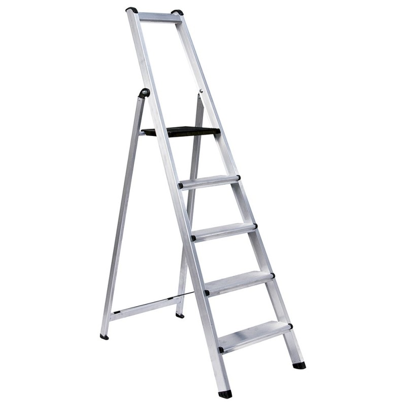 Escalera profesional en tijera. Peldaño ancho de 120 mm. Bisagra alta calidad. Tacos extra antideslizantes. Cinta seguridad.
