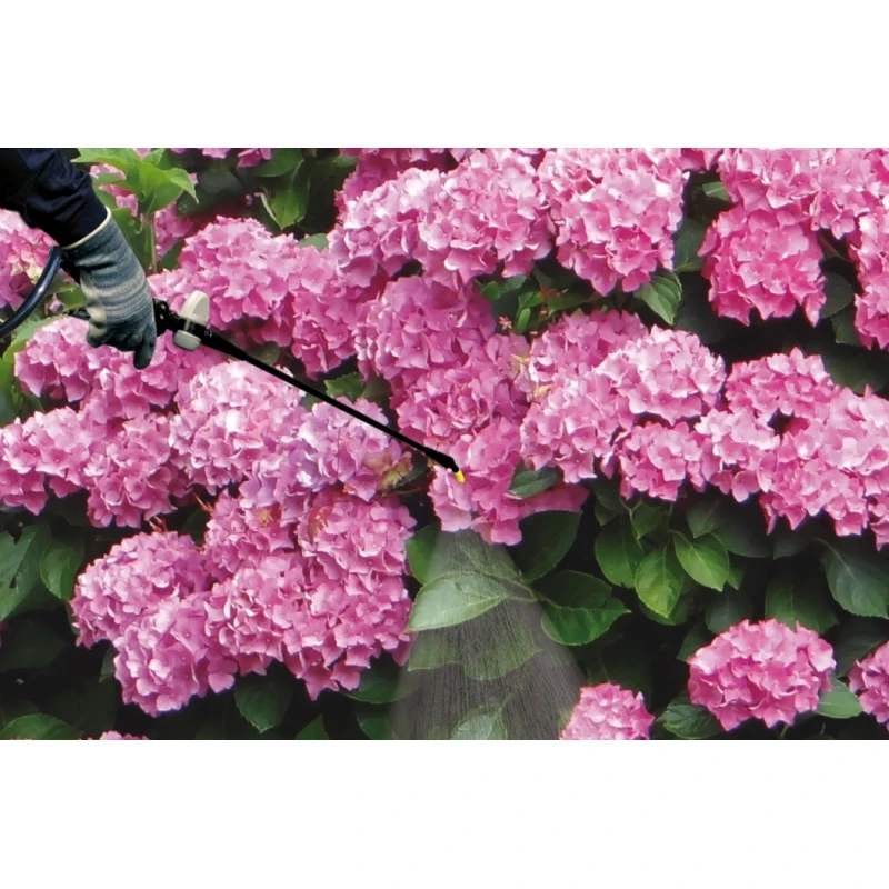 Pulverizador de presión retenida de 12 litros de capacidad, lanza de fibra de vidrio de 0,95 m. y manilla de acero inoxidable, indicador traslúcido de nivel lateral, correas acolchadas y regulables, asa de transporte integrada y ergonómica.