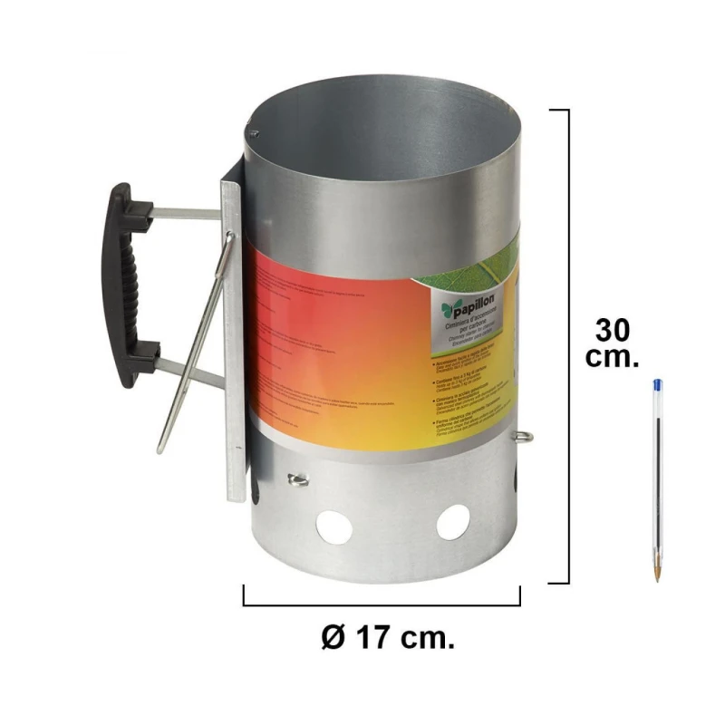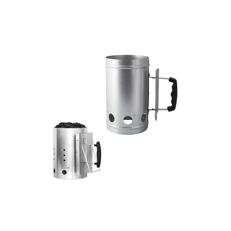 Encendedor barbacoas y chimeneas. Realizado en acero galvanizado con mango termoplástico. Forma cilíndrica para el encendido uniforme del carbón. Incluye asa para ayudar con el vaciado del carbón.