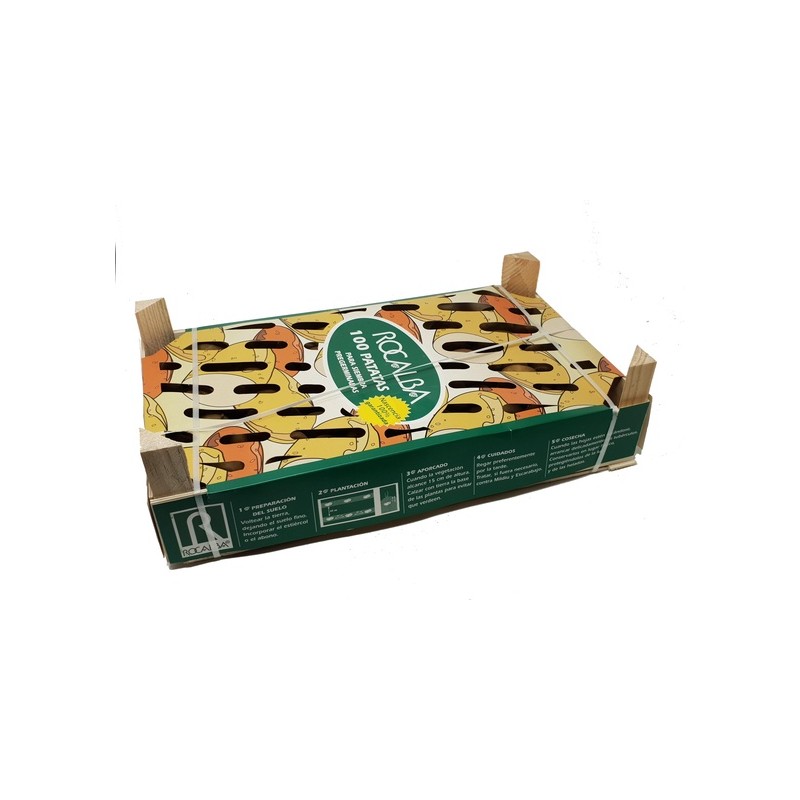 Caja con 100 unidades de patatas de siembra pregerminadas tipo Desirée de Rocalba. Un tipo de patata con un calibre de 28/40, forma ovoide muy grande, color de la piel rojo y carne amarillo y fina, de ciclo semitardio, talla muy grande y excelente rendimiento para cocción, freír y hacer puré, Follaje erecto. Con esta revolucionaria forma de plantar patatas obtendrás resultados más rápidos sin renunciar a un producto de alta calidad.
