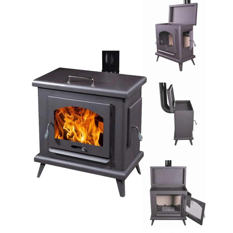 Magnifica estufa de leña, modelo C3, con horno para calentar platos, puerta lateral y salida de humos horizontal. Estufa compatible con troncos de hasta 62 cm.
