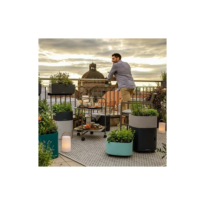 Perfecto para plantas aromáticas, verduras y fresas, el jarrón PILA da un toque de color a tu hogar y jardín. La maceta ofrece espacio para cuatro macetas de cultivo, mientras que el sistema de riego por mecha siempre suministra la cantidad adecuada de agua a las plantas, evitando la formación de estancamiento. Gracias al sistema modular, se pueden apilar hasta tres plantas o elementos de almacenamiento. Los módulos se pueden combinar como se desee en los diferentes colores modernos y son móviles gracias al soporte de ruedas a juego.