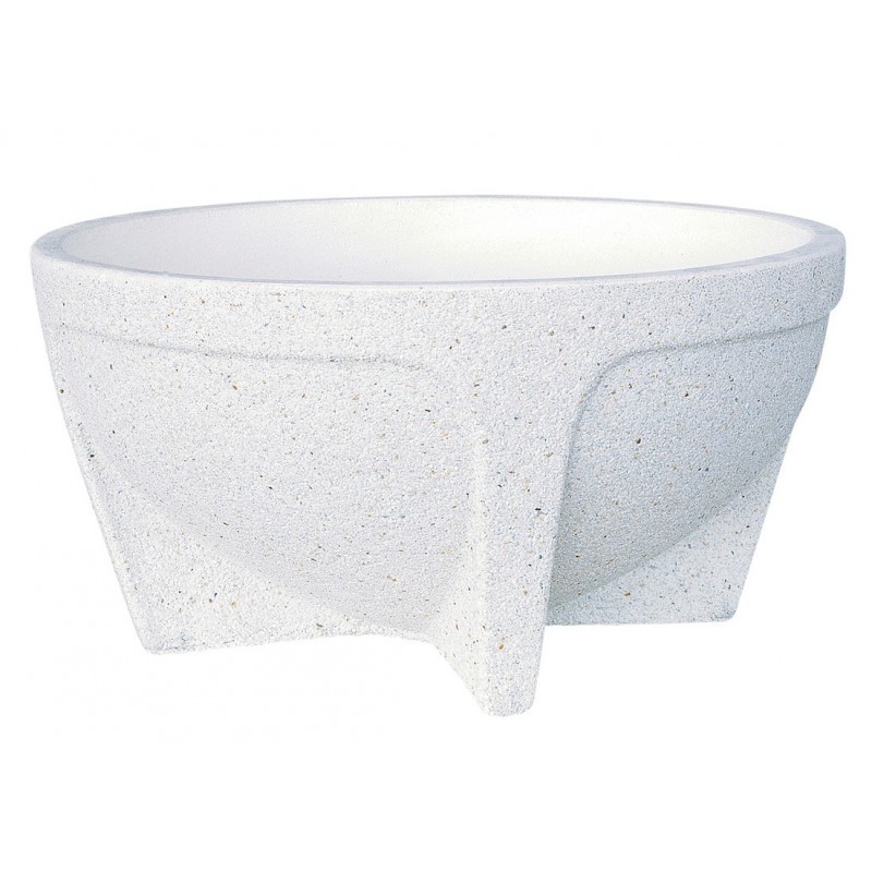 Macetero redondo de granito "china lavada", de diseño tradicional y resistente a las inclemencias del tiempo. Con patas incorporadas en el propio diseño. Ideal para plantar flores de temporada y otras. Color granito blanco.