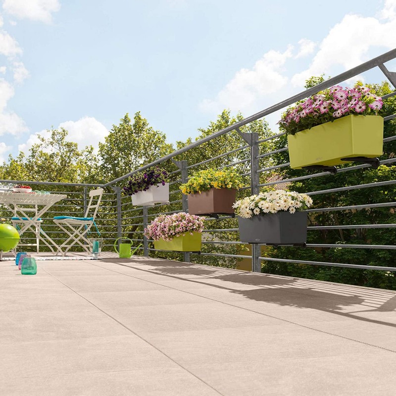 Jardinera pensada para colgar en balcón, de plástico liso de alta calidad. De colores modernos y acabado en mate.