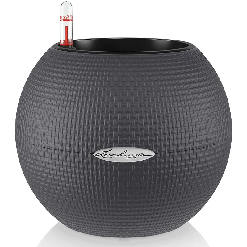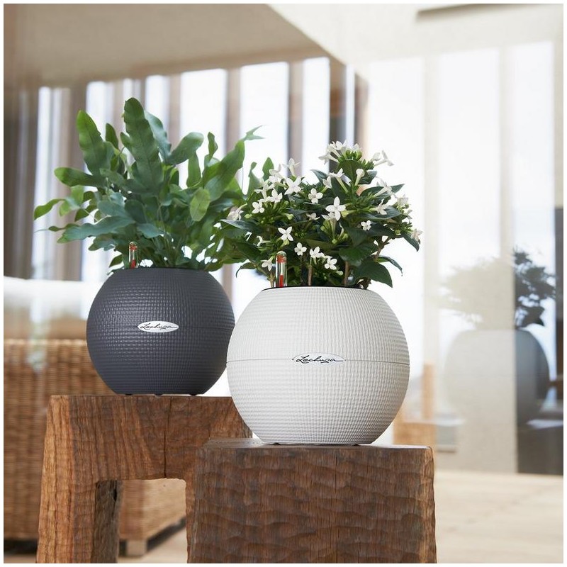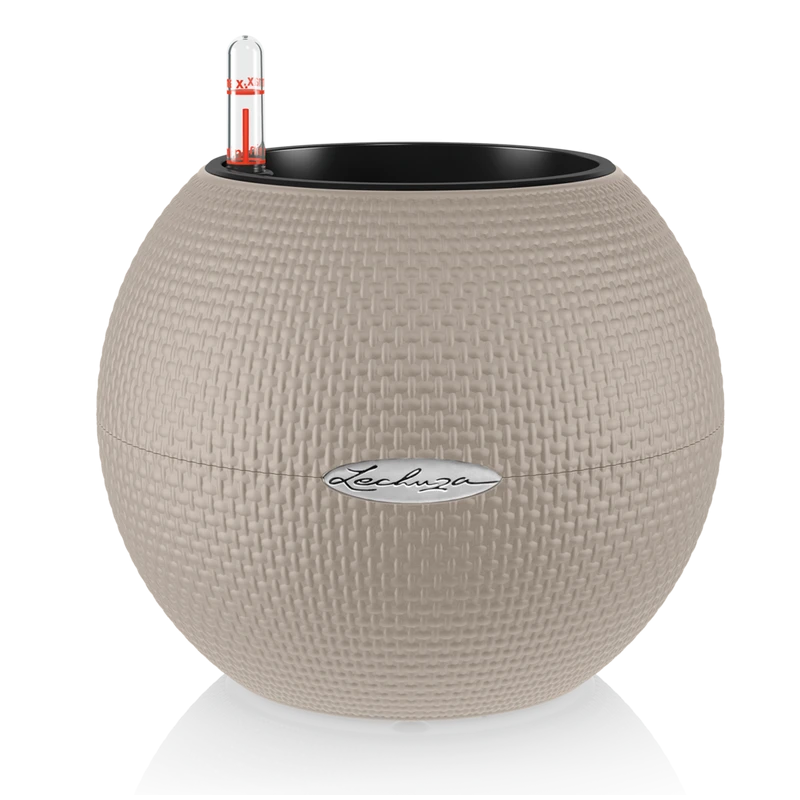 Maceta decorativa con sistema de autorriego que permite el desarrollo de sus plantas. Esta esfera satinada es el marco ideal para poner flores y plantas sobre la mesa.