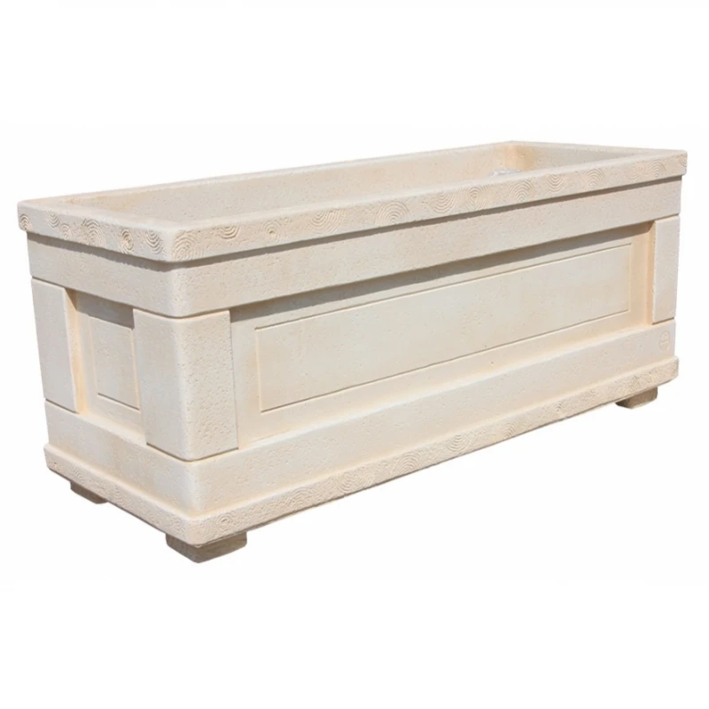 Jardinera rectangular granito "china lavada" y cantos pulidos. Con patas incorporadas en el propio diseño. Es ideal para plantar flores de temporada y otras. Resistencia máxima a la intemperie. Color granito blanco.