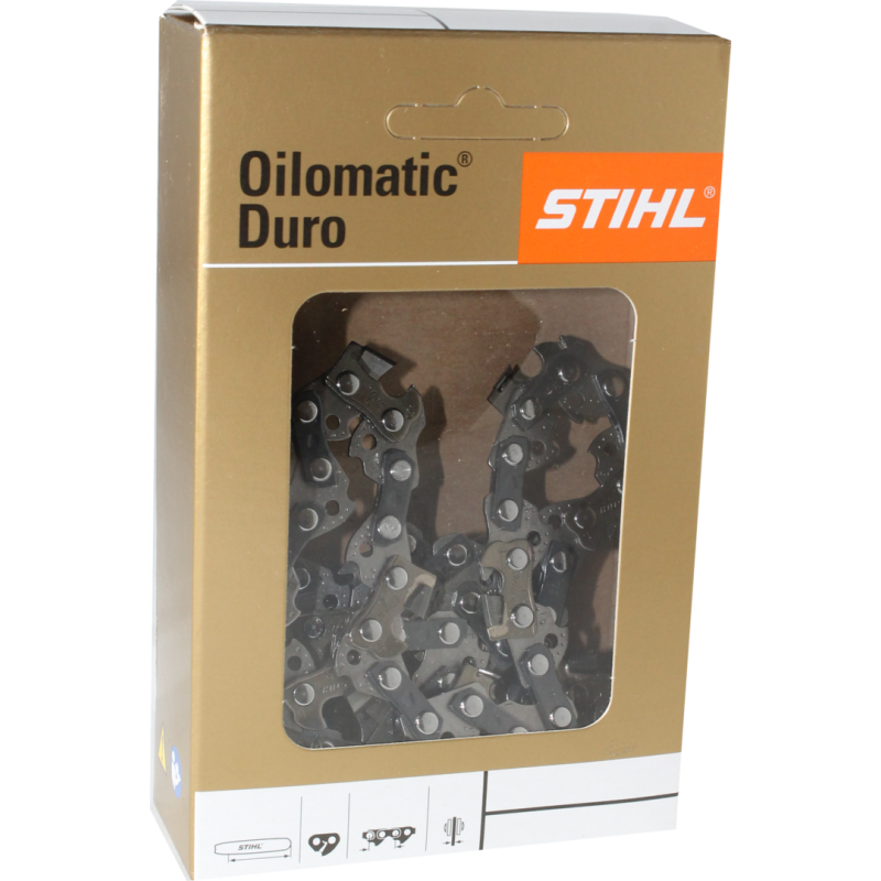 Un corte impecable: el afilado de la nueva cadena de motosierra de metal duro . Rapid Duro 3 dura cuatro veces más que una cadena de corte convencional. Los dientes de corte extraduros permiten que la cadena se mantenga afilada aún cuando entre en contacto con la tierra.