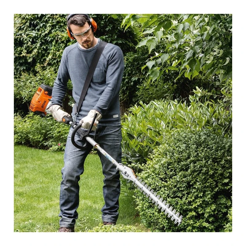 Cortasetos de altura con caja reductora ajustable en 145º. Para trabajos exigentes en setos altos y  para trabajo al ras del suelo. Reductor con variador mecánico ajustable por niveles, posición de transporte compacta.