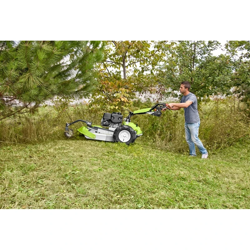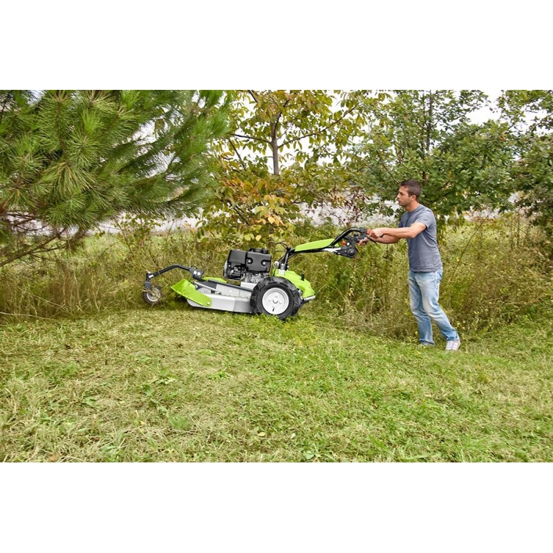 Gran maniobrabilidad de la desbrozadora profesional Grillo CL 75 permite un corte de hierbas altas y malezas rápido y sin esfuerzo. Es una desbrozadora hidrostática con bloqueo diferencial y frenos, regulación altura de corte progresiva por manivela. La desbrozadora CL 75 trabaja en terrenos irregulares con pendientes sin ningún problema ya que la perfecta distribución del peso y unos neumáticos apropiados permiten una adherencia sin igual. Ruedas de tractor, rueda delantera maciza a prueba de pinchazos.