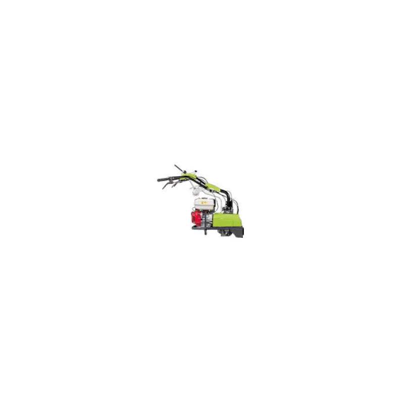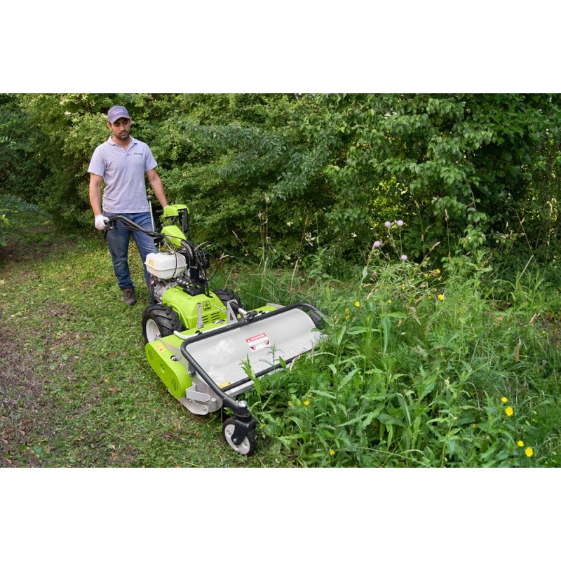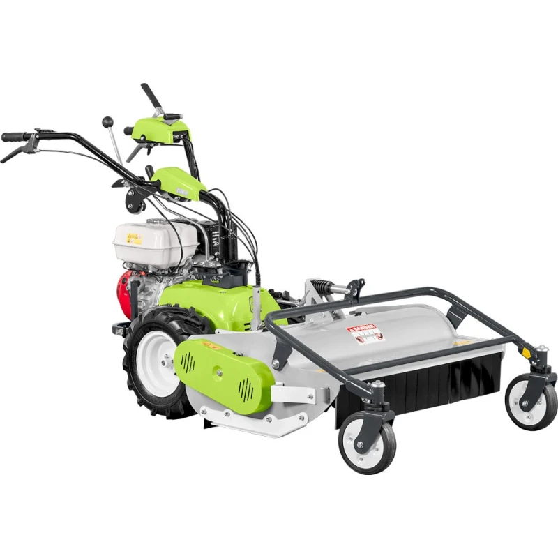 En el manillar los mandos se encuentran en posición confortable y pueden ser fácilmente utilizados con una sola mano. El freno de estacionamiento es por mando a pedal. Regulación altura de corte progresiva por manivela. Ruedas tractor, rueda delantera maciza a prueba de pinchazos.