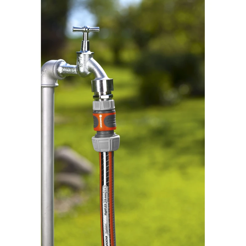 El conector rápido Gardena 19 mm (3/4") permite una conexión rápida y cómoda da la manguera. A través de un sencillo tirón, se desconecta la conexión. La manguera de jardín se puede conectar fácilmente al grifo. Un anillo de goma proporciona una protección adicional al producto.