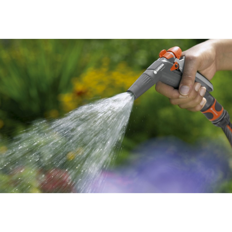 La boquilla para pistola con control de flujo Gardena ofrece todo lo que necesita para regar, la boquilla para pistola pequeña y compacta se adapta bien a la mano gracias a los componentes de plástico blando integrados. Con la regulación de flujo infinitamente ajustable, se puede utilizar idealmente. Su función de chorro duro es adecuada para la limpieza y la función de niebla fina es ideal para pulverizar plantas frágiles. Si el flujo de agua debe ser continuo, puede bloquear el disparador de pulso. De este modo se evita el cansancio de la mano.
