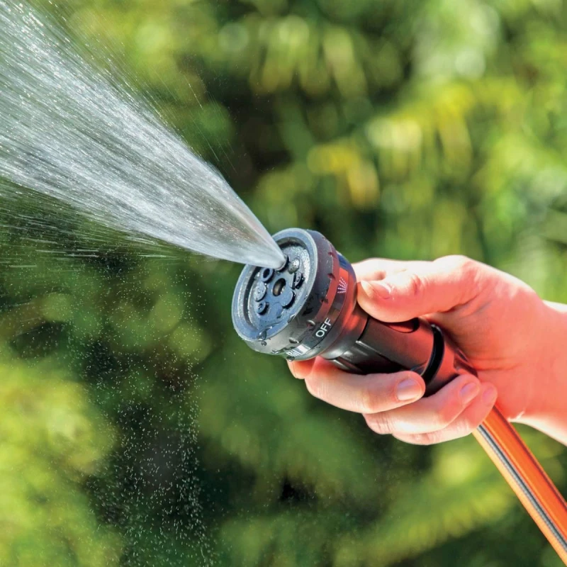 Kit compuesto por conexión de grifo 3/4”, conectores automáticos y lanza multifunción, para escoger entre 6 chorros distintos (+ 2 posiciones OFF)