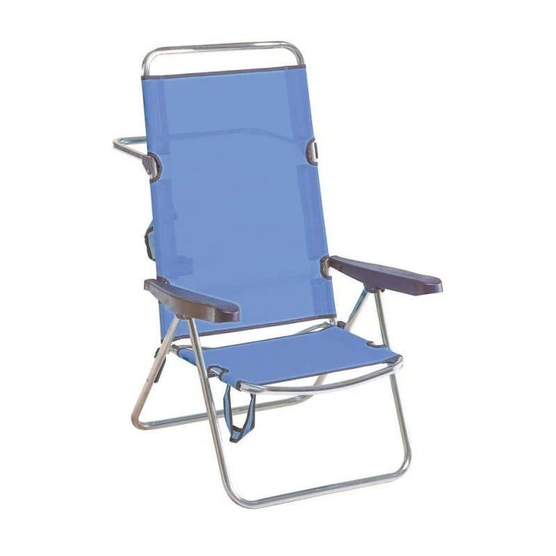 Silla baja plegable con 4 posiciones distintas y respaldo alto. Sistema de plegado de seguridad para almacenarlo cuando acabe el verano. Se fabrica en tubo de aluminio  redondo ligero que evita la anticorrosión y con...
