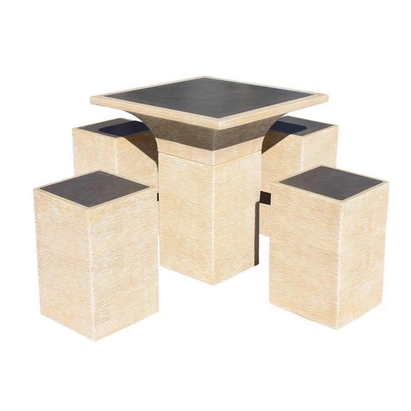 Conjunto de comedor fabricado en hormigón con alta durabilidad, preparado para el uso en exterior. Compuesto por 1 mesa rectangular, 2 bancos rectos y 2 bancos pequeños sin respaldo. Azulejo "Vulcan" color gris....