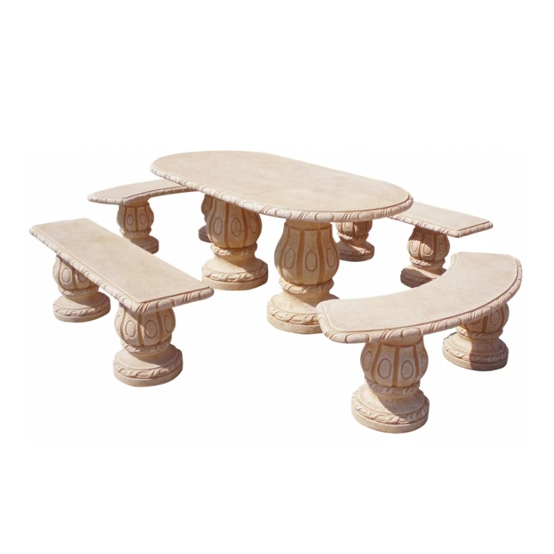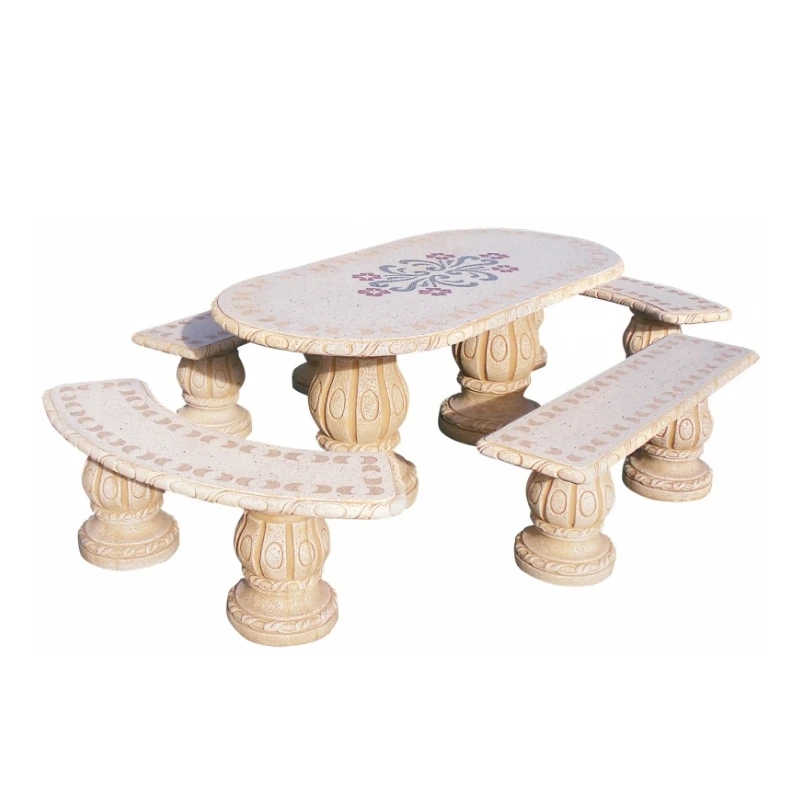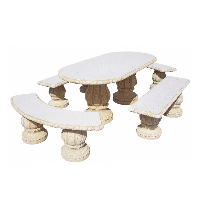 Conjunto de comedor fabricado en hormigón con alta durabilidad, preparado para el uso en exterior. Compuesto por 1 mesa ovalada, 2 bancos curvos y 2 bancos rectos. Acabado decorado. Superficies pulidas con motivos florales. Piedra color ocre.