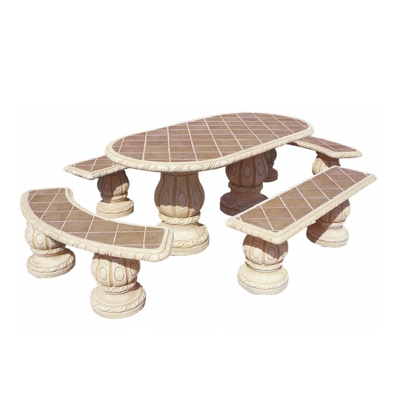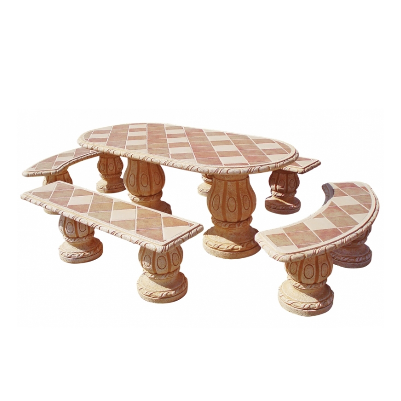 Conjunto de comedor fabricado en hormigón con alta durabilidad, preparado para el uso en exterior. Compuesto por 1 mesa ovalada, 2 bancos curvos y 2 bancos rectos. Azulejo gres "Goltis" piedra color ocre. Resistentes...