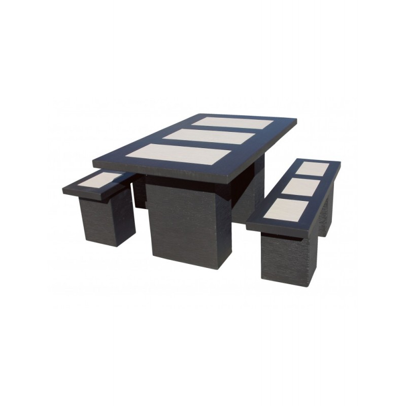 Conjunto de comedor fabricado en hormigón con alta durabilidad, preparado para el uso en exterior. Compuesto por 1 mesa rectangular, 2 bancos rectos y dos bancos pequeños. Resistentes a las inclemencias del tiempo.
