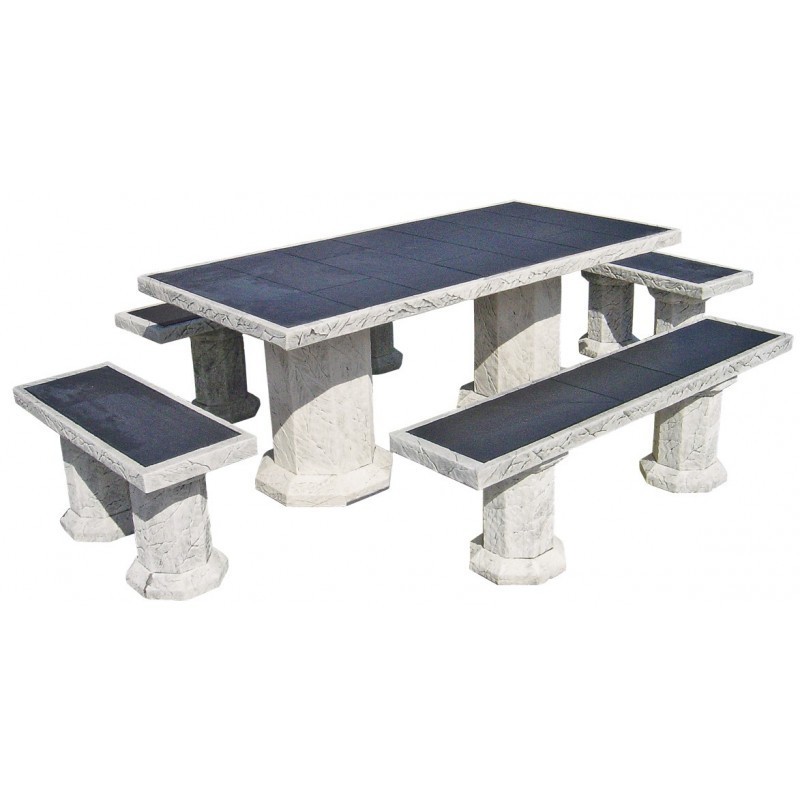 Conjunto de comedor fabricado en hormigón con alta durabilidad, preparado para el uso en exterior. Compuesto por 1 mesa rectangular, 2 bancos rectos y 2 bancos pequeños sin respaldo. Azulejo "Vulcan" color gris. Resistentes a las inclemencias del tiempo.