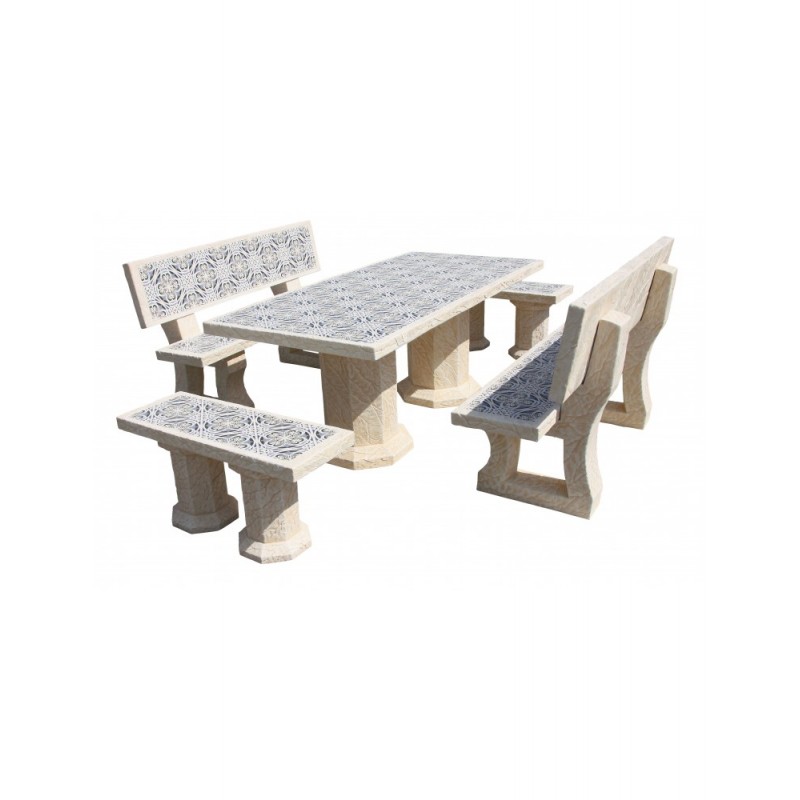 Conjunto de comedor fabricado en hormigón con alta durabilidad, preparado para el uso en exterior. Compuesto por 1 mesa rectangular, 2 bancos rectos con respaldo y 2 bancos pequeños. Azulejo "Deico" piedra color plata.