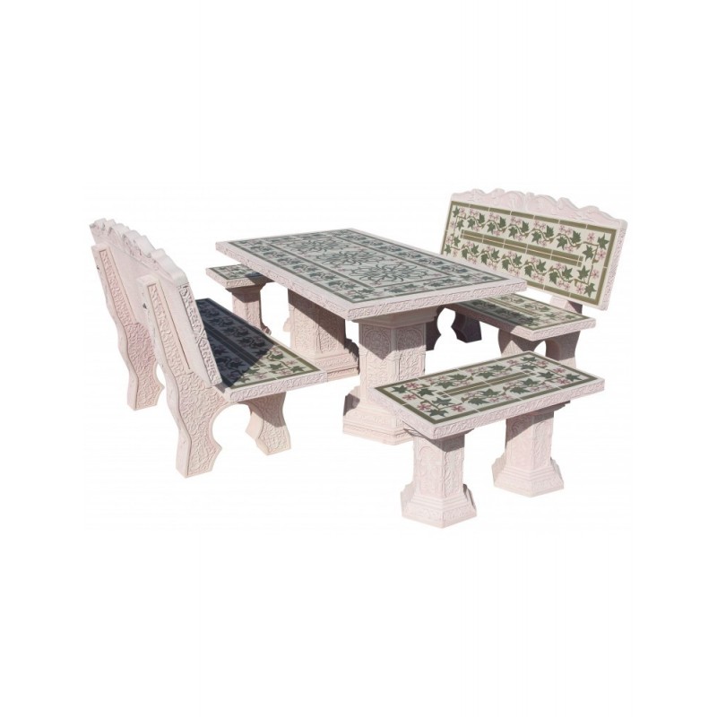 Conjunto de comedor fabricado en hormigón con alta durabilidad, preparado para el uso en exterior. Compuesto por 1 mesa rectangular, 2 bancos rectos con respaldo y 2 bancos pequeños. Azulejo " Goltis" piedra color ocre.