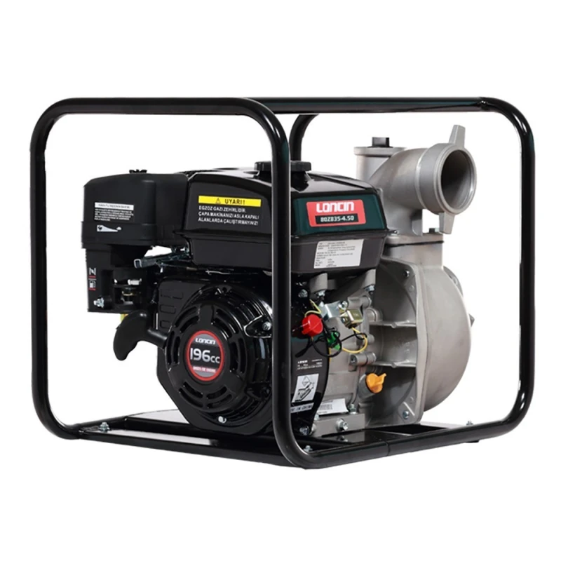 Motobomba a Gasolina Loncin LC80ZB35 con motor de gasolina 4 tiempos de 196 c.c. de cilindrada. Caudal Máximo: 60.000 Litros a la hora. Altura Manométrica Máxima: 35 metros. Aspiración e Impulsión: 80 mm - 3". Ideal para evacuación y drenaje de aguas, para vaciado de pozos, piscinas, aljibes y desagües. La potencia de extracción permite el vaciado de urgencia de sótanos, garajes y habitáculos que se hayan inundado a causa de la lluvia, avería u otros.