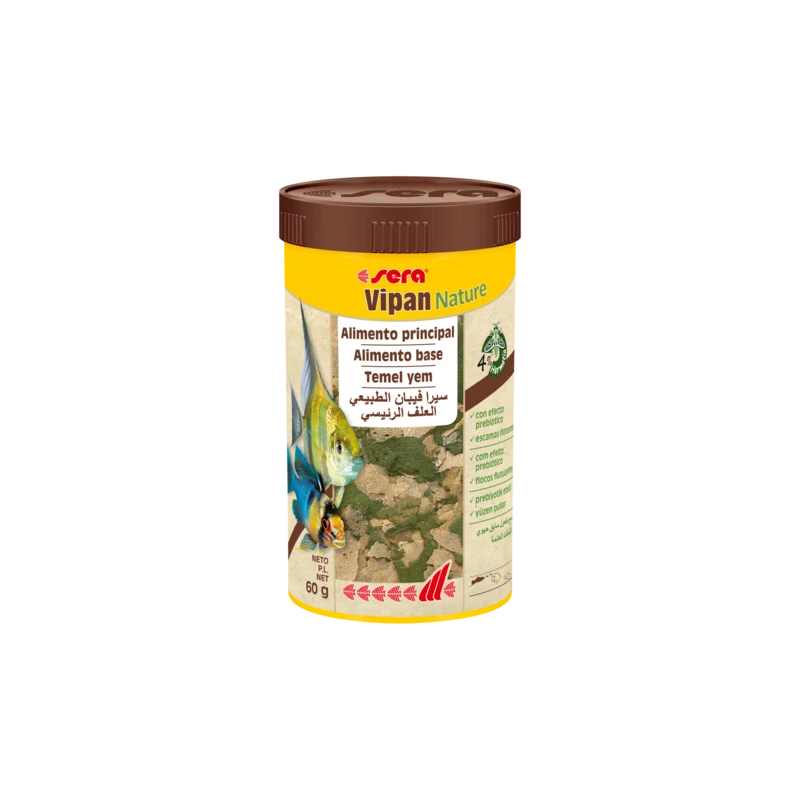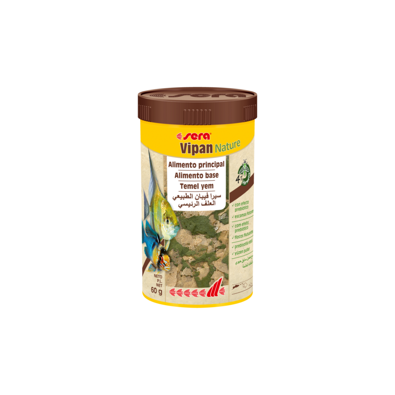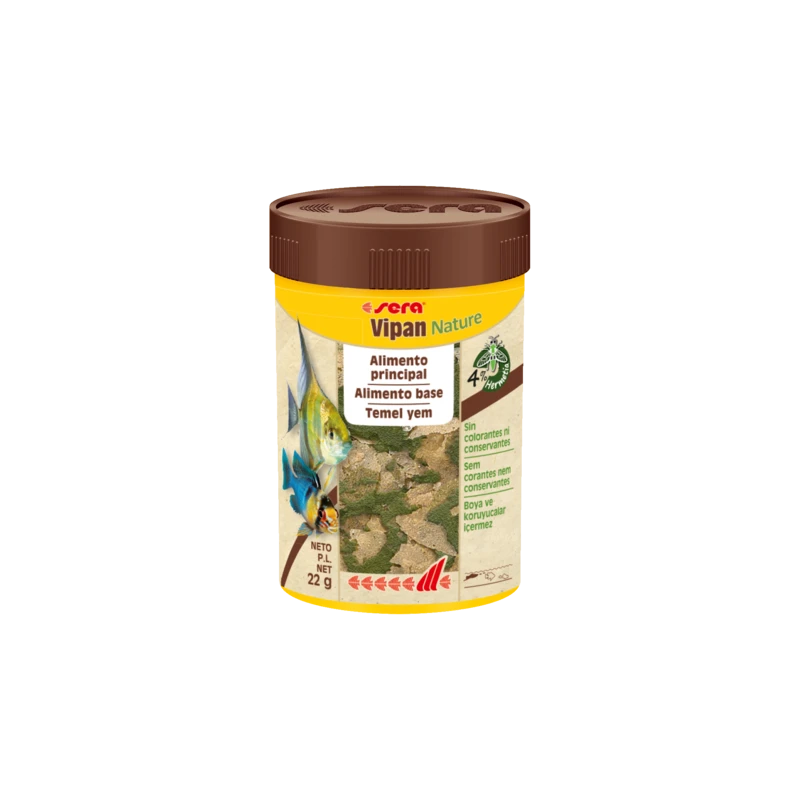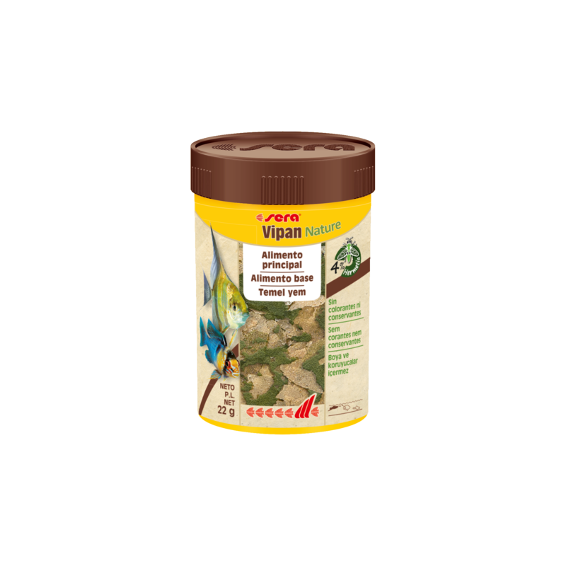 Sera Vipan Nature es el alimento principal que se compone de escamas flotantes, sin colorantes ni conservantes, para todos los peces ornamentales que se alimentan en la superficie. Con harina de insectos, contiene una fuente de proteínas de alta calidad. Su fórmula equilibrada con ingredientes naturales y prebióticos permite una alimentación especialmente natural, que favorece el crecimiento sano y un fuerte desarrollo. Las escamas mantienen su forma en el agua y no enturbian el agua.