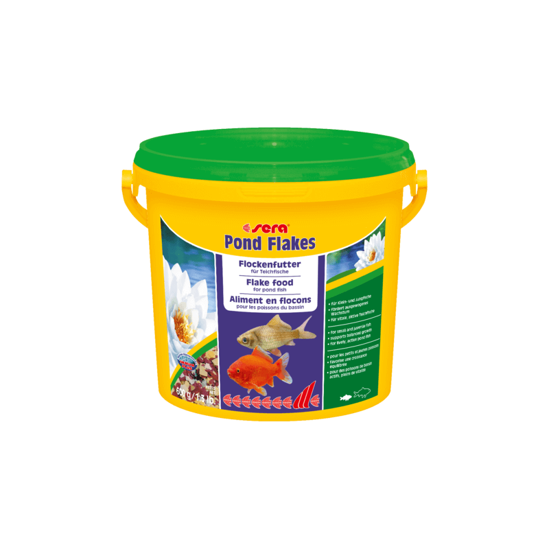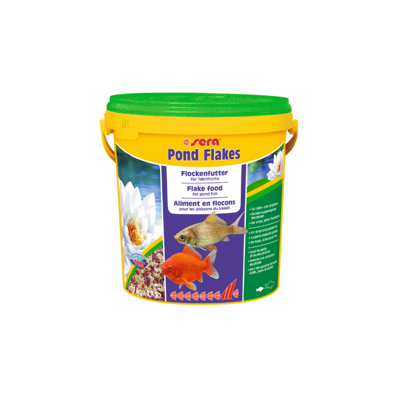 Sera Pond Flakes es el alimento principal que se compone de escamas cuidadosamente elaboradas, para todos los peces pequeños del estanque, como las carpas doradas y los ródeos (Rhodeus amarus), así como para los peces jóvenes.