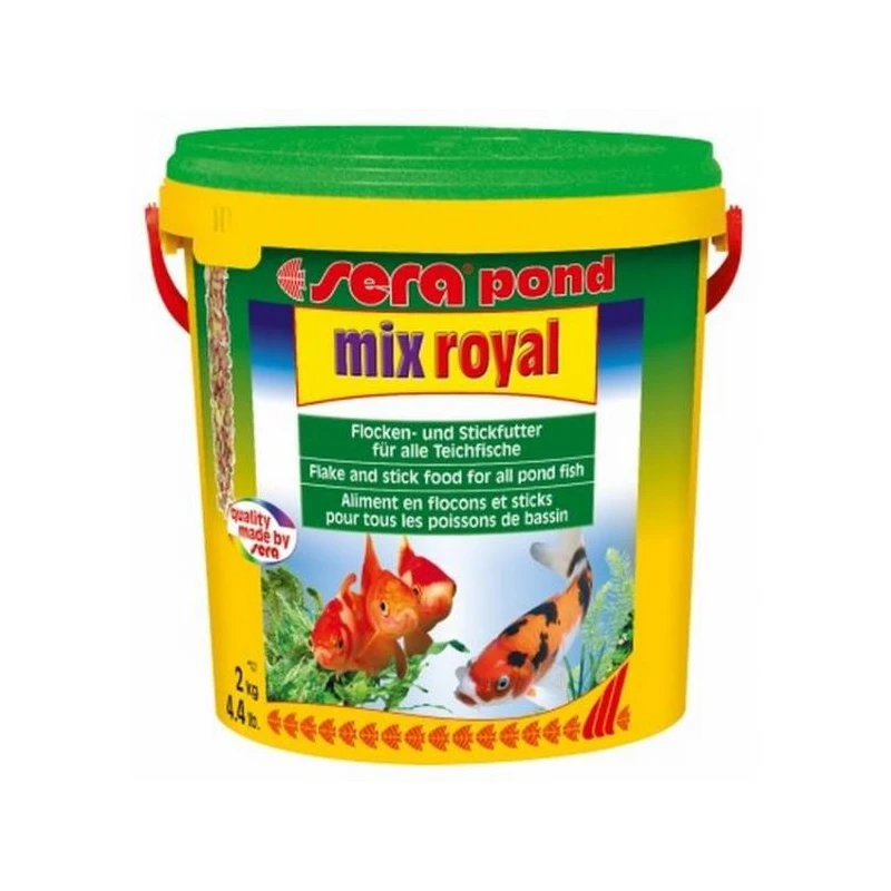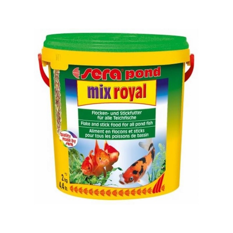 Sera Pond Mix Royal Alimento Peces Escama Granulado es un alimento completo para alimentar a todo tipo de peces de estanque. Los gránulos energéticos aportan la alimentación equilibrada para los peces mayores de 6 cm, y las escamas, de digestión más sencilla, aportan el alimento exacto a los peces pequeños. Alimento muy delicioso, gracias a los gammarus liofilizados con todo cuidado: una exquisitez para peces de estanque.